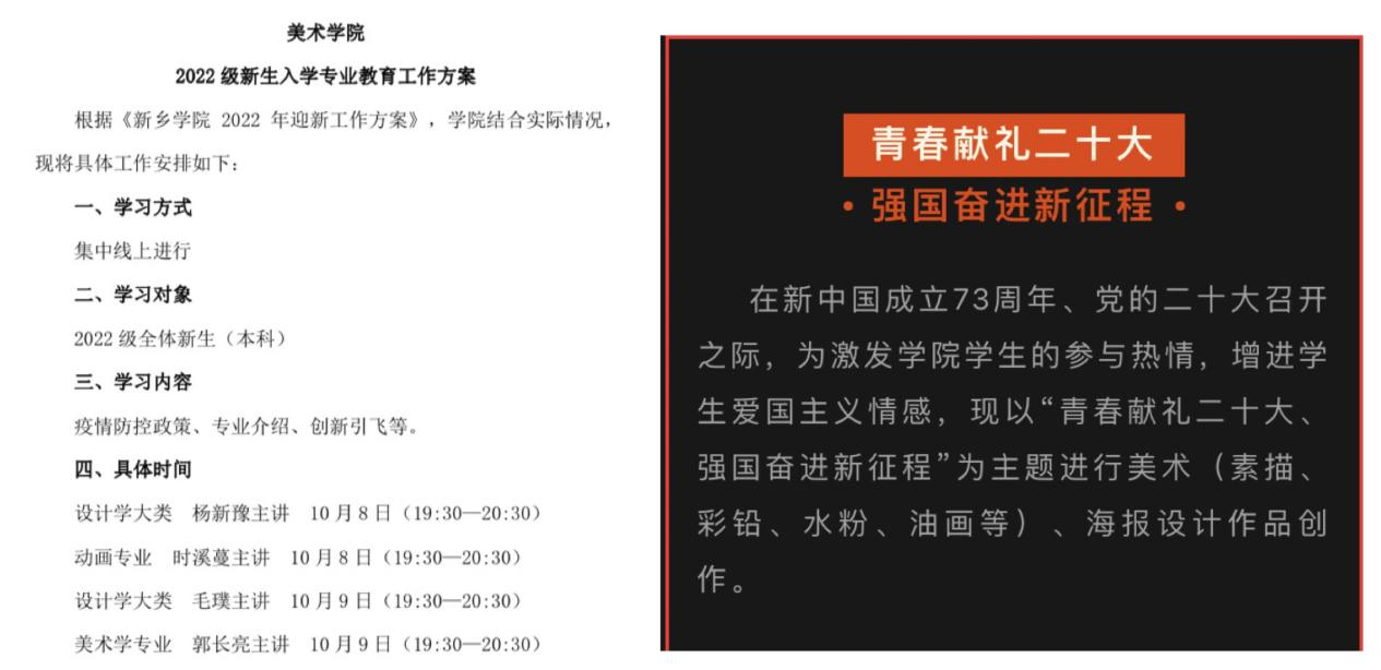 新生入学教育为期一个多月,正值中国共产党第二十次全国代表大会召开,学院积极组织新生收看大会开幕,并举办了“青春献礼二十大 ‘青’述我们这十年”、“青春献礼二十大——科学防疫 共护校园 ”主题团日活动,以及具有学院特色的“青春献礼二十大、强国奋进新征程”主题美术、海报设计作品征集活动。新生们抒发着心中对党和祖国的热爱,为党和祖国献上最真切的祝福。