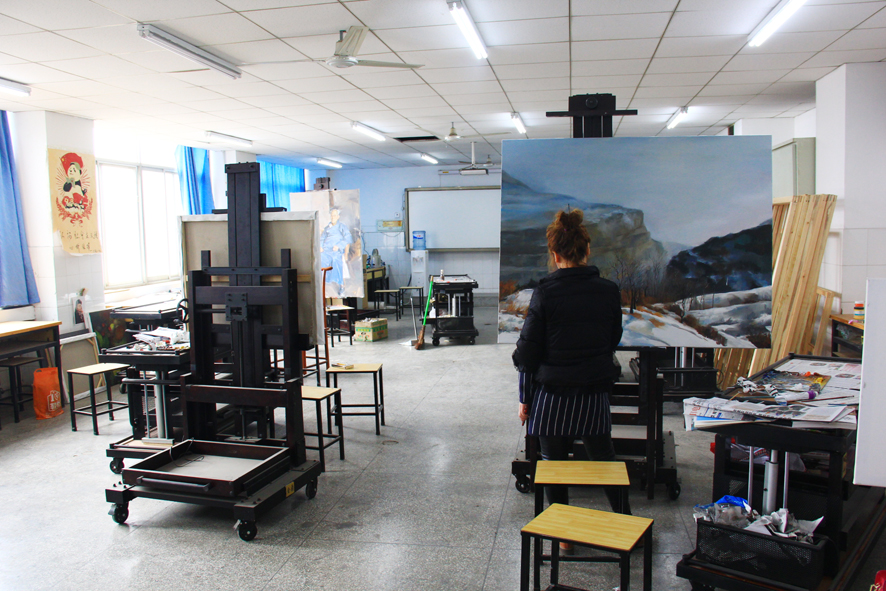 油画工作室:现有大型专业画架7张、大型专业画车7个等设备。该工作室主要承担师生油画创作的任务。