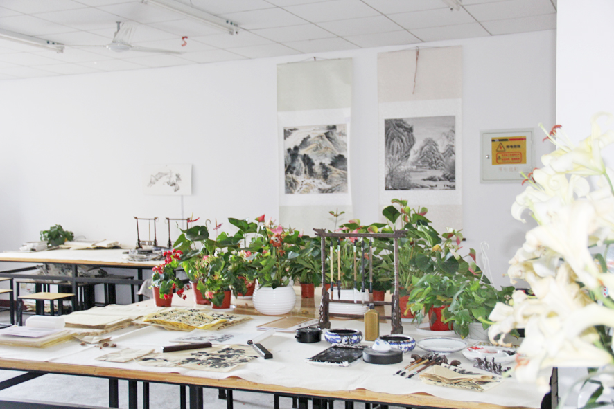 国画工作室:该工作室现有六张国画案,还有整面毛毡墙。该工作室主要承担师生国画创作的任务。