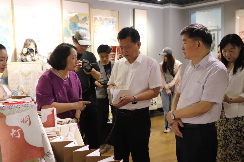 开幕式后,与会领导参观了油画、国画、版画、环艺建筑模型、视觉传达产品与动画短片及周边文创等多个作品展区,与同学们亲切交流互动,认真听取同学们的创作理念和心路历程,并参与体验非物质文化遗产漆扇制作过程,感受传统文化魅力。