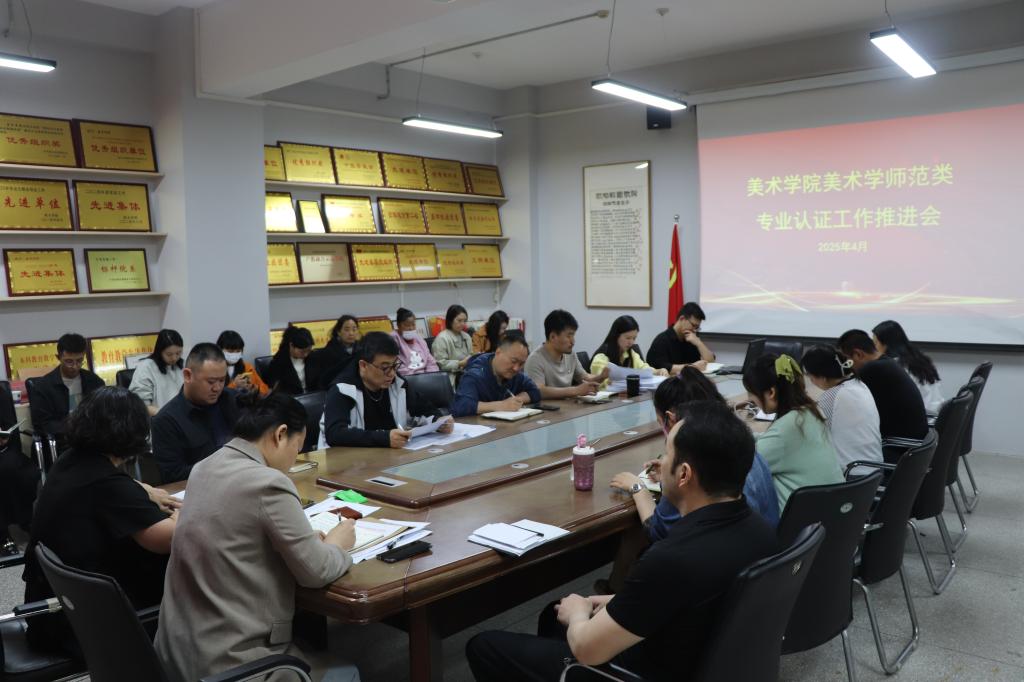 4月21日上午,我院在A10楼二楼会议室开展师范类专业认证工作推进会。书记李秀霞、副书记李耷、院长耿聪、副院长单伟、副院长毛璞、教科研秘书郭颖、教研室主任郭长亮、相关美术学专业老师以及所有行政人员参加了此次会议。会议由耿聪院长主持。